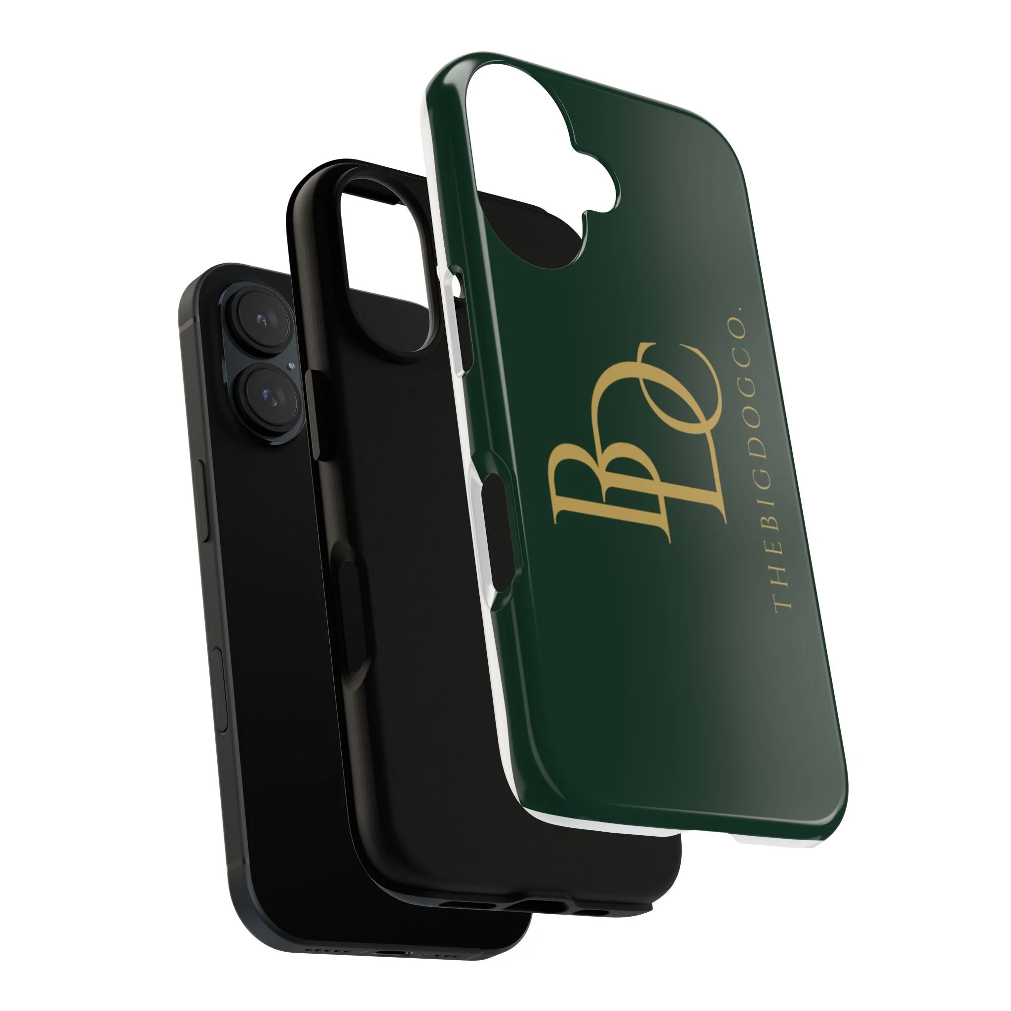 A sleek protective phone case with a refined, minimalist monogram design in deep forest green and warm gold accents. The glossy finish highlights the rich color and crisp logo transfer, while the dual-layer construction—rigid polycarbonate shell and soft TPU silicone liner—keeps your phone cushioned from drops and everyday knocks. Lightweight and slim, it slides easily into pockets and bags, yet offers clear port access and supports wireless charging. Built to last outdoors with UV-resistant inks and certified material compliance, this case brings quiet luxury and dependable protection to daily carry.